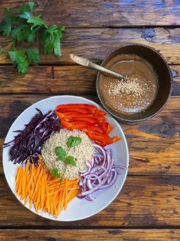 Quinoa, légumes croquants et sauce cacahuète onctueuse pour un bol sain, gourmand et équilibré.