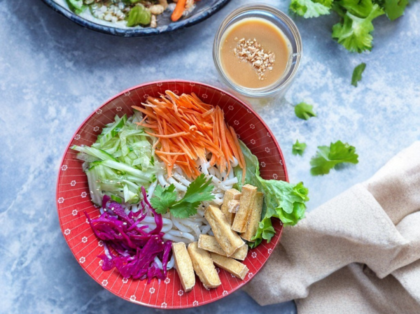 Nouilles udon, légumes frais, tofu doré et sauce sésame crémeuse pour une salade légère et savoureuse.